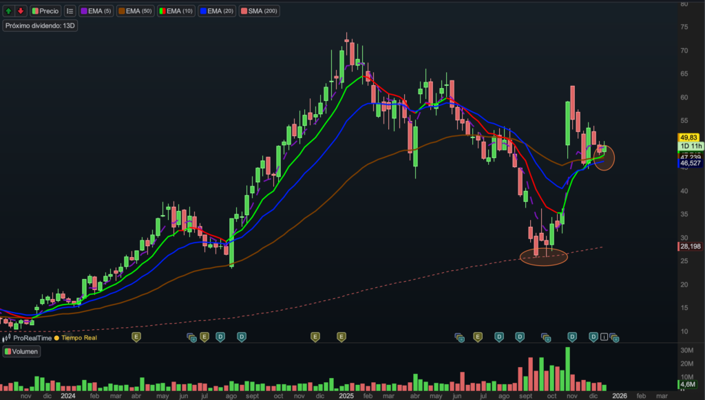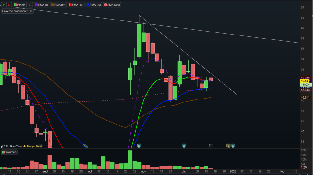 Desde el punto de vista operativo, la zona de 51 USD representa el nivel de compra más claro, ya que implica la ruptura de la directriz correctiva y abre la puerta al inicio de un nuevo impulso alcista.