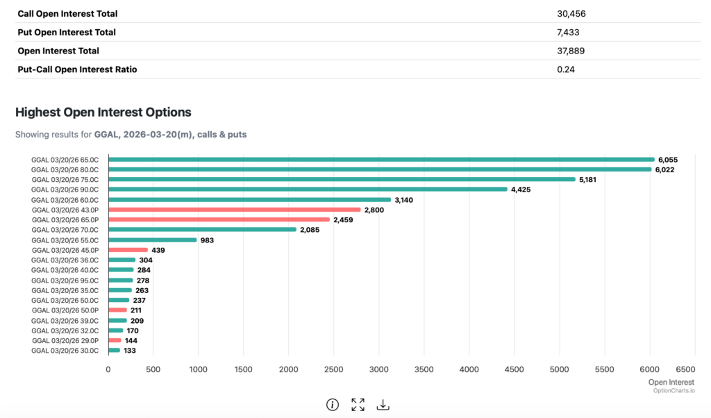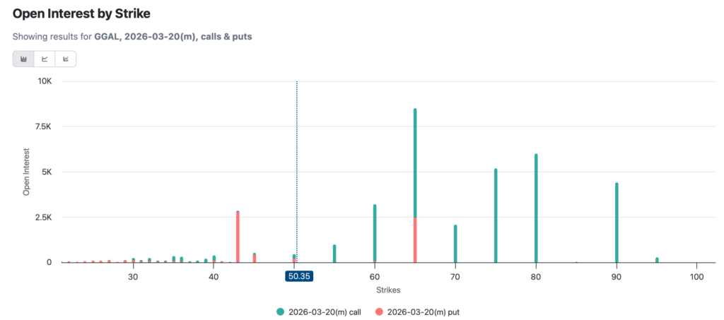Interés notable en el strike 65 y 80, vencimiento 20 marzo 2026.