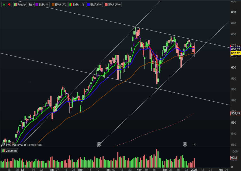 En el gráfico del ETF argentino podemos observar un comportamiento algo más fuerte que el del mercado estadounidense. Aun así, se repite una estructura muy similar, con el precio estrechándose progresivamente. Este tipo de formaciones no pueden prolongarse de manera indefinida, por lo que todo apunta a que en el corto plazo deberíamos ver una resolución clara, con una ruptura al alza o a la baja.