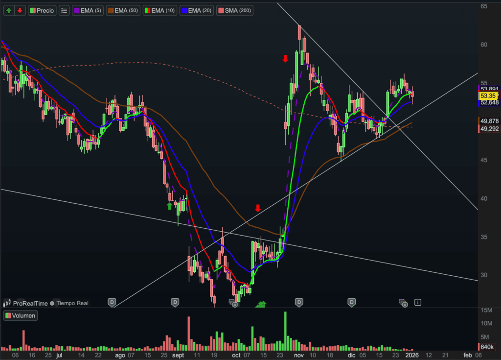En este caso, el escenario que esperamos es una salida por la parte alta. El presidente Milei mantiene una postura claramente alineada con las políticas de Estados Unidos, por lo que un impulso positivo en los mercados estadounidenses podría trasladarse de forma directa al mercado argentino. De darse este movimiento, tendría un impacto favorable en el gráfico argentino y, en consecuencia, en las acciones que mantenemos en Grupo Financiero Galicia (GGAL).