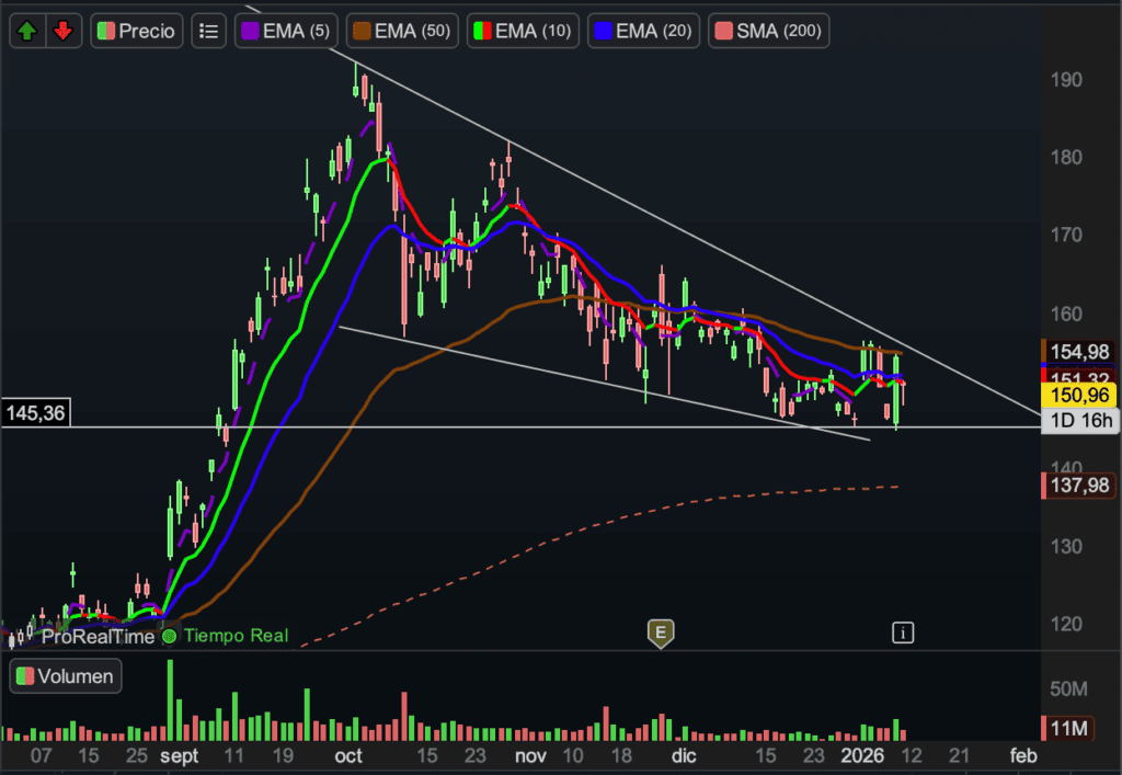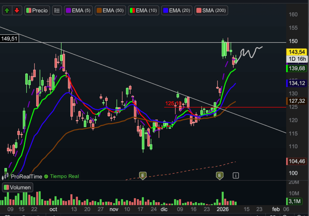 Se trata de uno de los nombres más comentados del momento y, por información contrastada, sabemos que este trade está en el radar de muchos participantes del mercado. Por el momento, mantenemos la posición. STOP 30% 139,89 70% SIN