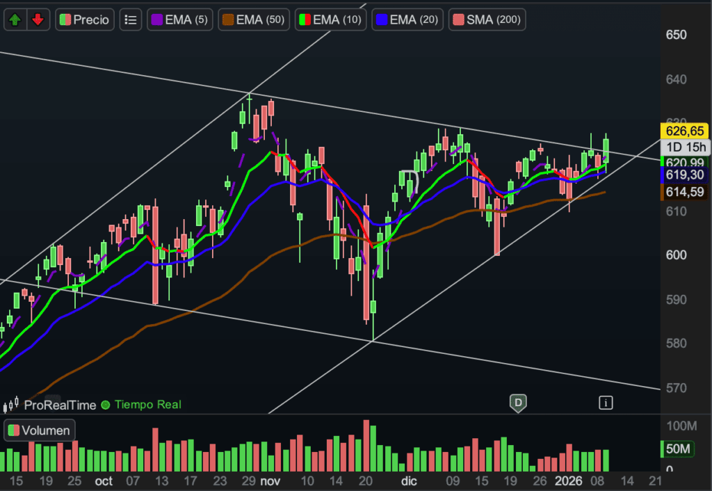Desde el punto de vista técnico, el QQQ cerró el viernes rompiendo al alza la formación de diamante que habíamos comentado anteriormente, una señal que refuerza el sesgo positivo a corto plazo.