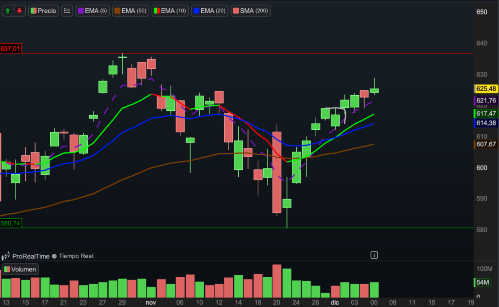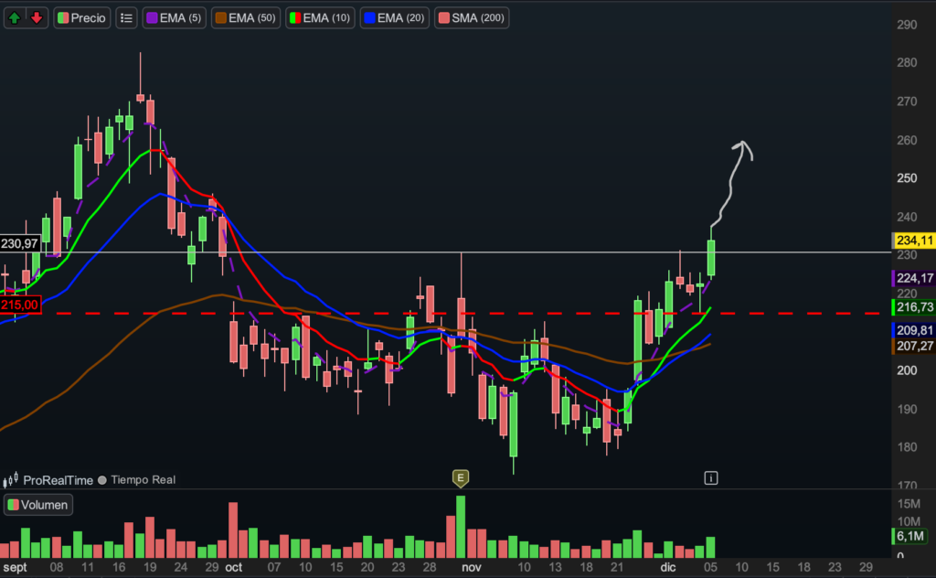 La posición continúa en terreno claramente positivo y el comportamiento técnico es extraordinario. El activo está desarrollando un cup and handle muy limpio, con proyección directa hacia la zona de 300 si la estructura se confirma.