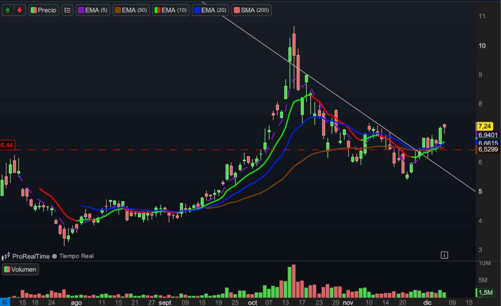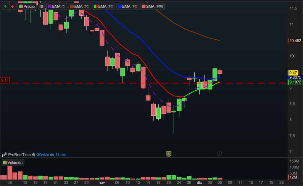 Este es un gráfico poco habitual en nuestra operativa, ya que hemos entrado en una acción en mínimos. Sin embargo, el comportamiento reciente justifica la excepción: el precio ha recuperado medias, presentó un gap up sólido y acompañó con earnings positivos, señales que apuntan a un posible cambio de compostura en el activo.