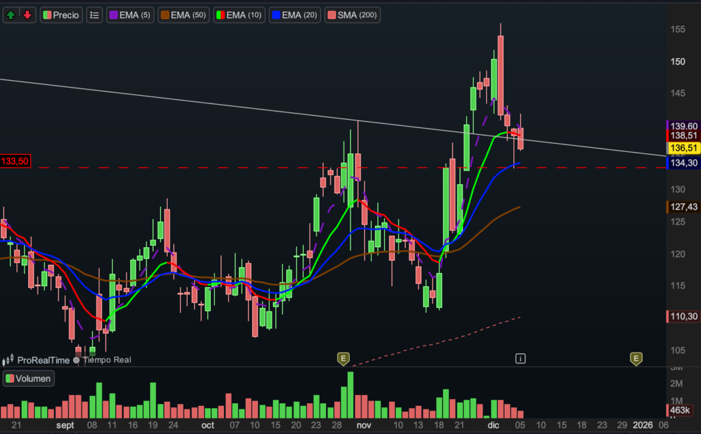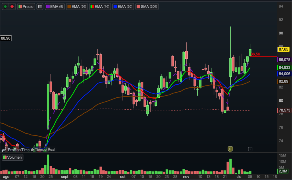 Es una acción con un gráfico de calidad AAA, mostrando una estructura técnica impecable. Sin embargo, el stop queda muy ajustado, lo cual supone un inconveniente. Aun así, dadas las condiciones actuales del mercado, no podemos permitirnos regalar riesgo, por lo que mantenemos la gestión estricta del stop pese a lo estrecho del margen. STOP 86.49. En caso de que nos eche, recompramos mas adelante.