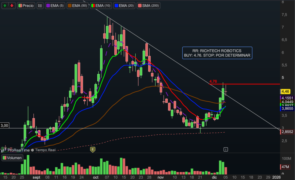 Se trata de una acción barata y altamente volátil, perteneciente a un sector muy atractivo y con fuerte potencial. Dado su comportamiento, estamos gestionando la posición con un enfoque mixto: