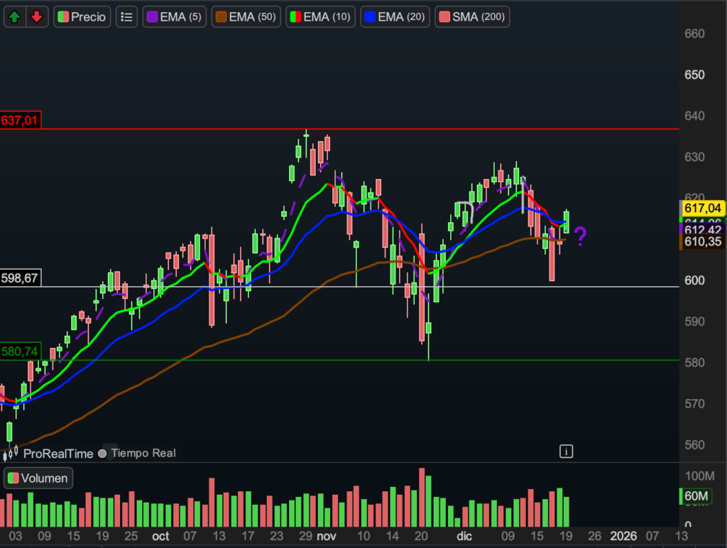 El QQQ cerró el viernes por encima de todas sus medias móviles, logrando salvar una semana más y, en esta ocasión, con una señal clara de fortaleza tras la corrección reciente. Este comportamiento refuerza la idea de que el mercado vuelve a situarse en un entorno de RISK ON.