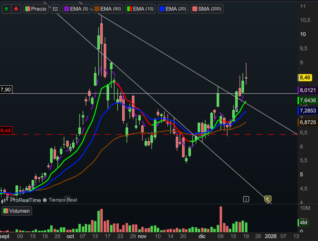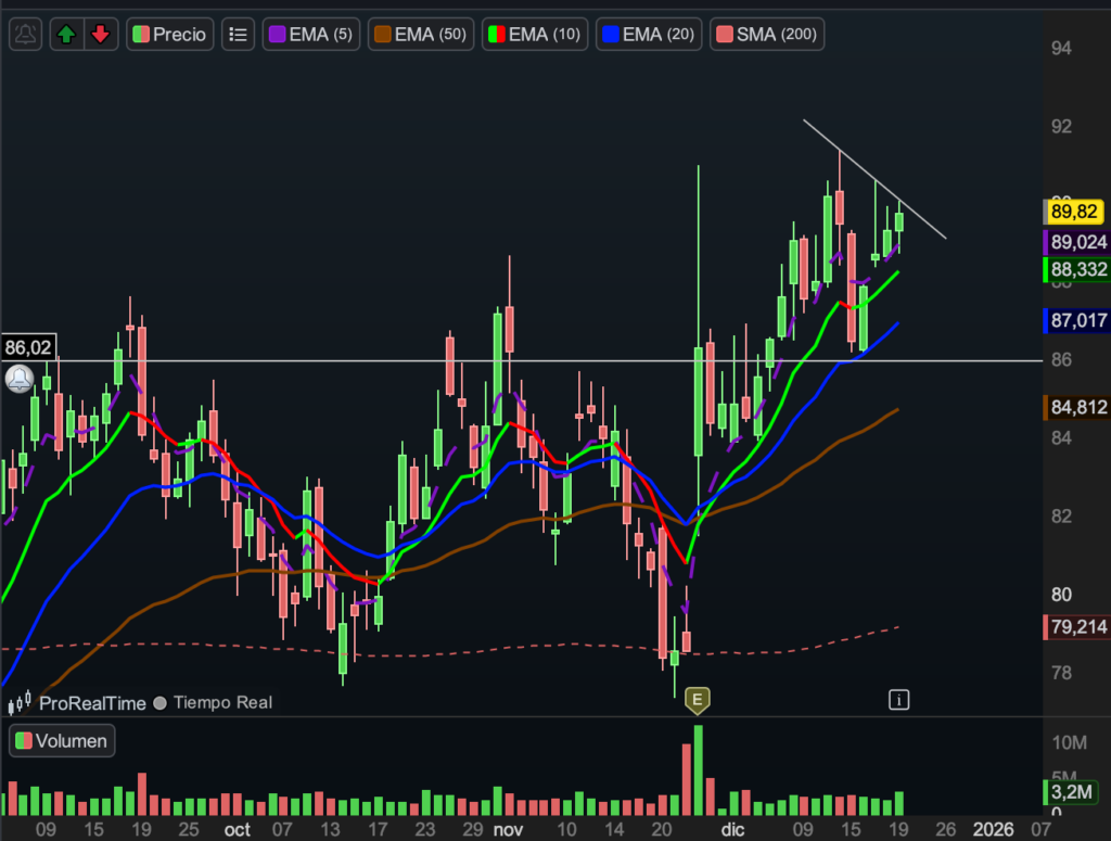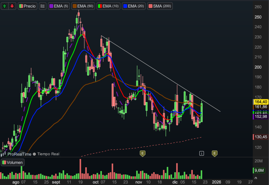 Actualmente, las medias móviles se encuentran algo alejadas del precio, por lo que no sería extraño —ni negativo— ver un periodo de movimiento lateral acompañado de un retesteo de medias, escenario que consideramos incluso muy saludable para la continuidad de la tendencia.