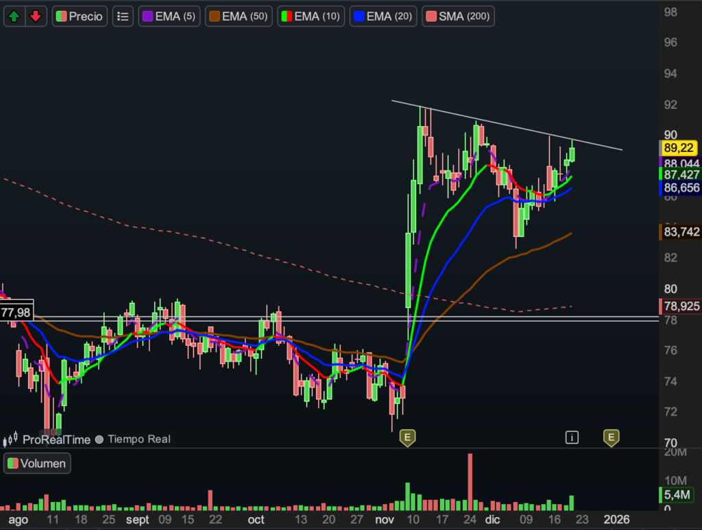Actualmente acumulamos una posición del 15%, combinando acciones y opciones. Contemplamos la posibilidad de aumentar la exposición hasta un 20% adicional en la zona de los 90 USD, decisión que se evaluará en función de la confirmación del movimiento (opcional, no obligatoria).